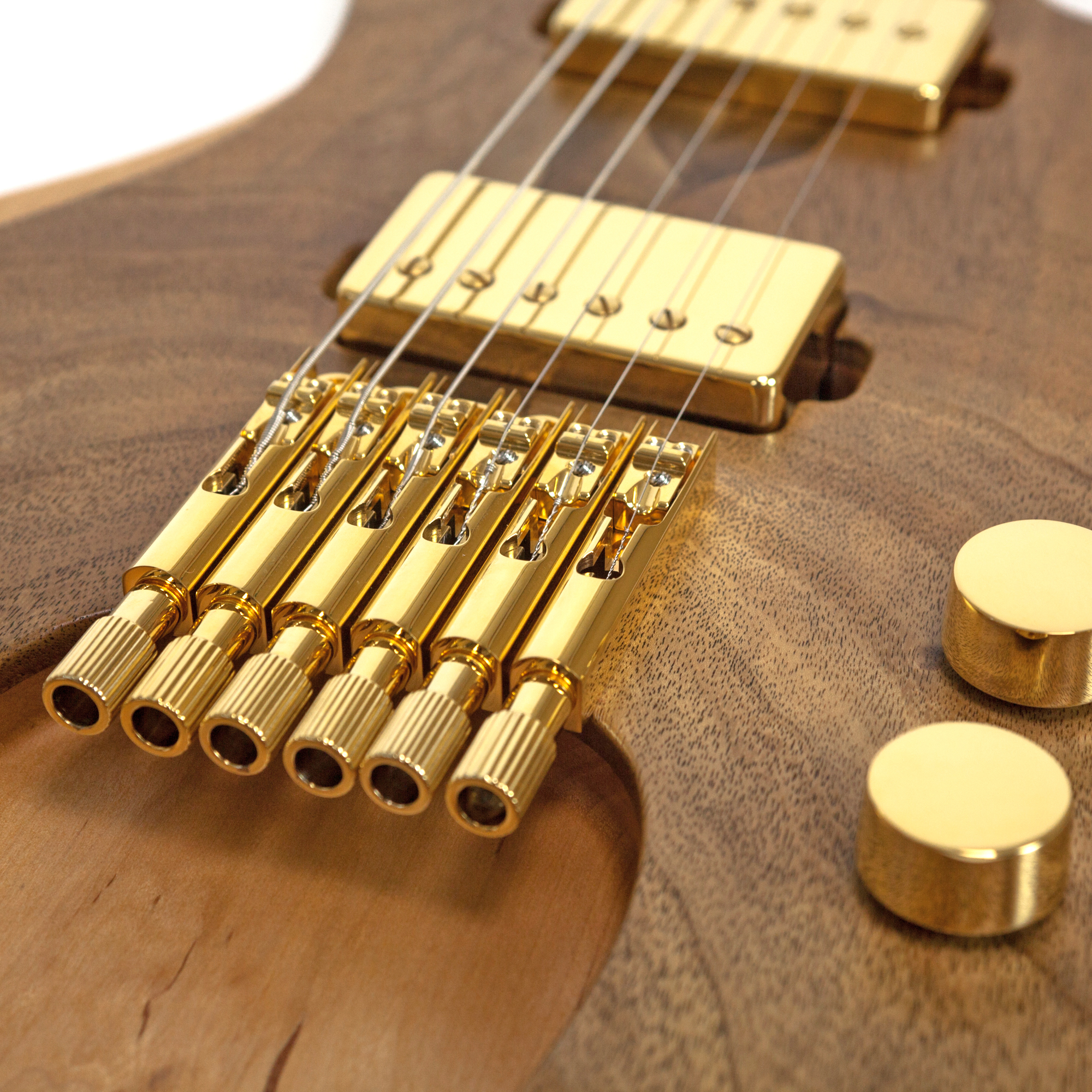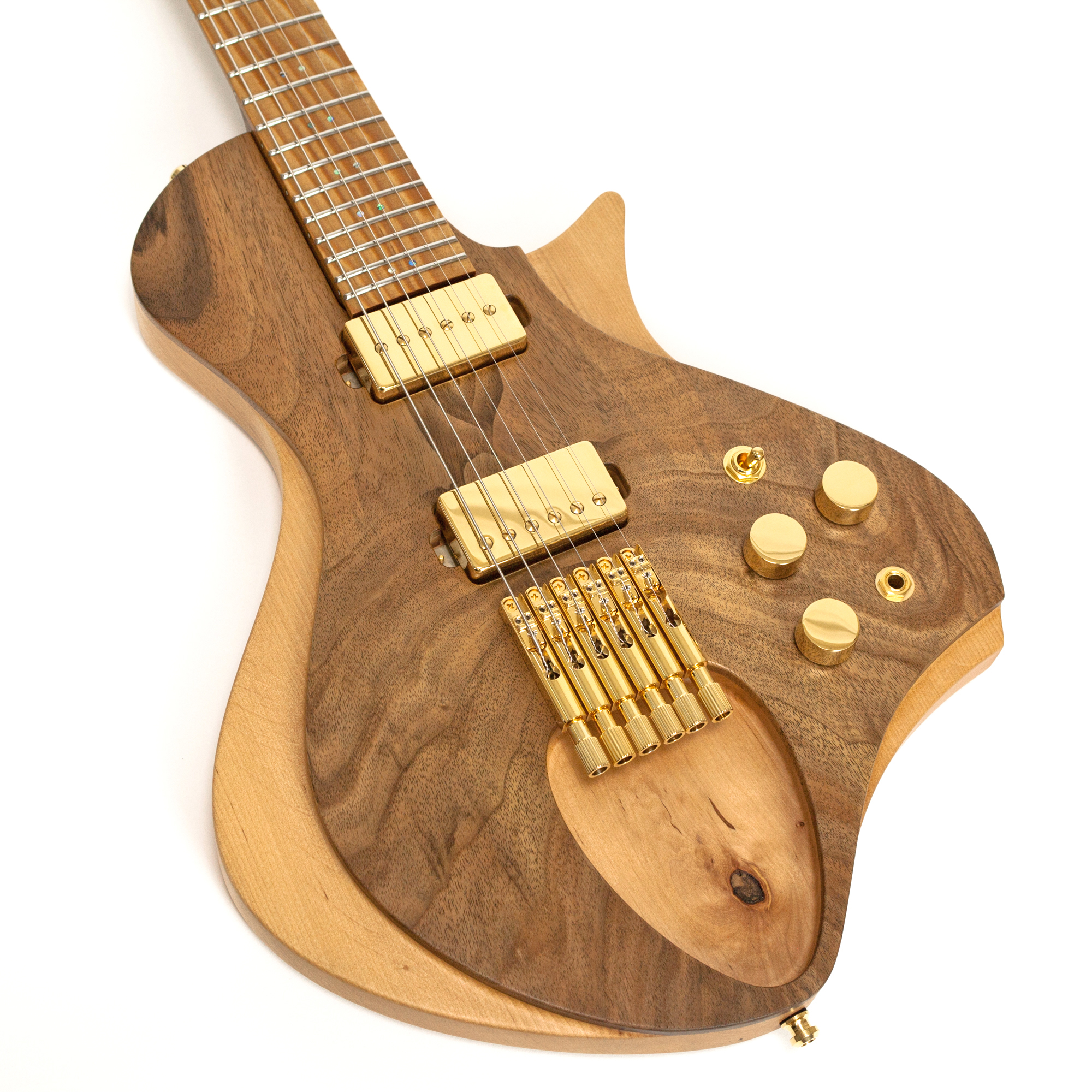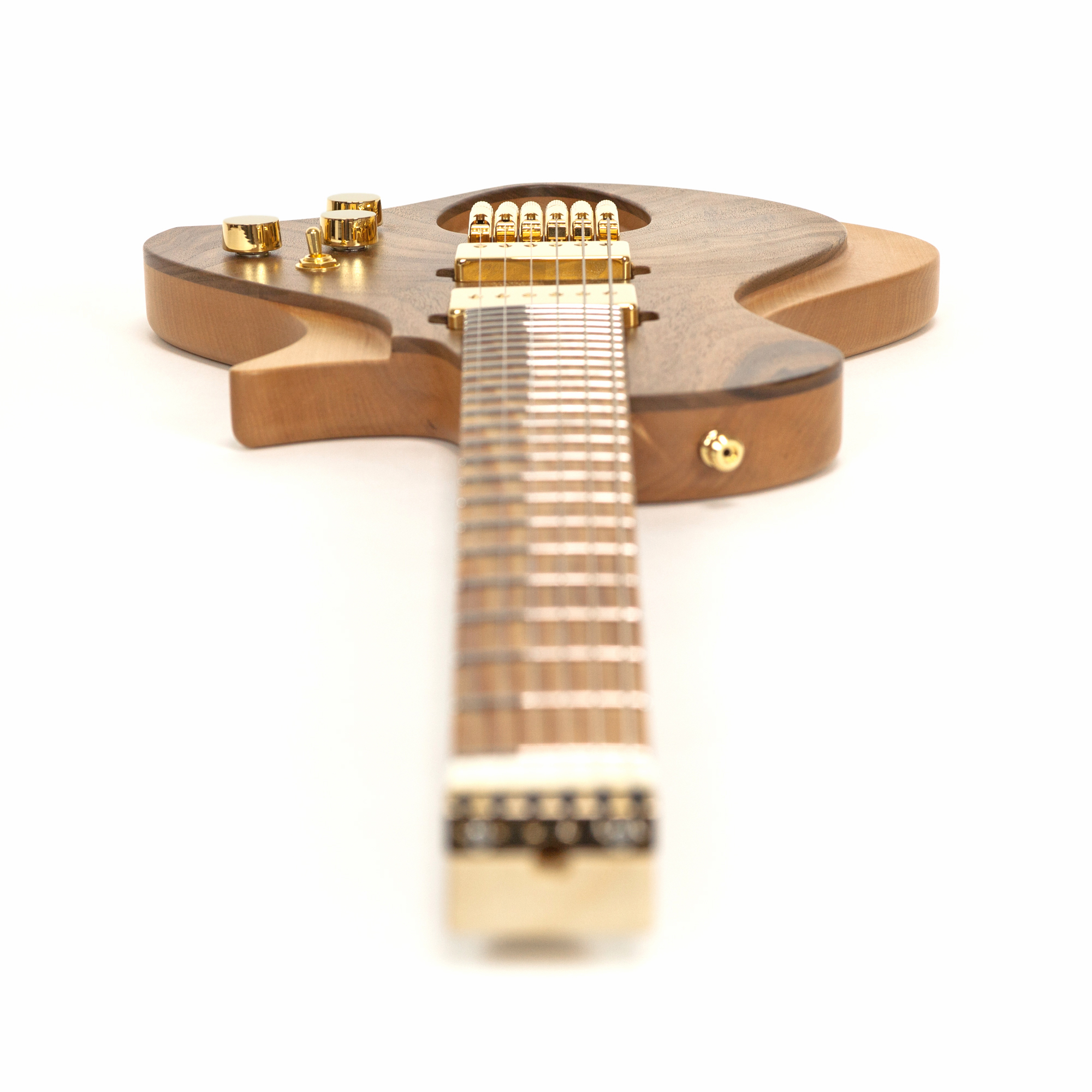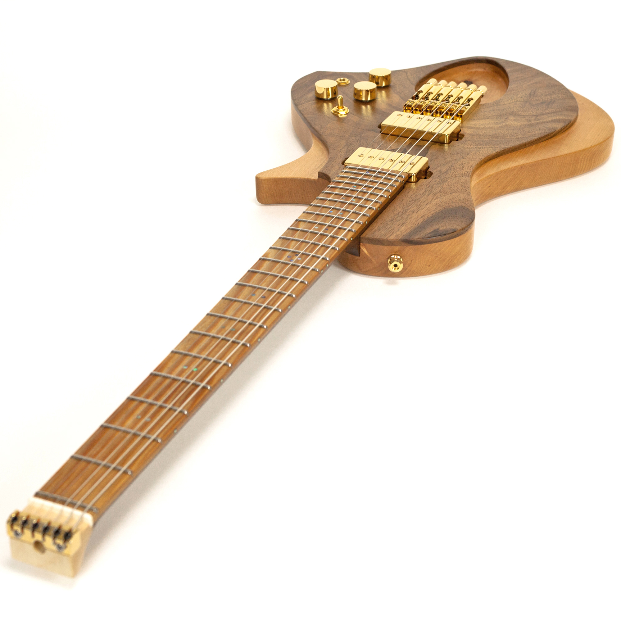 This guitar is shining with royal elegance. It is not a screamer, instead it is inspiring by its harmonic aura. Walnut and alder are building the contrast for the body. The golden hardware blends harmoniously into the color scheme. The fretboard material is Sonowood, a hightech material made of 100% wood with no additives, being harder than ebony (thats why it is also called “Swiss Ebony”). Furthermore the neck features a titan reinforcement. Both contribute to an almost endless sustain of the guitar.