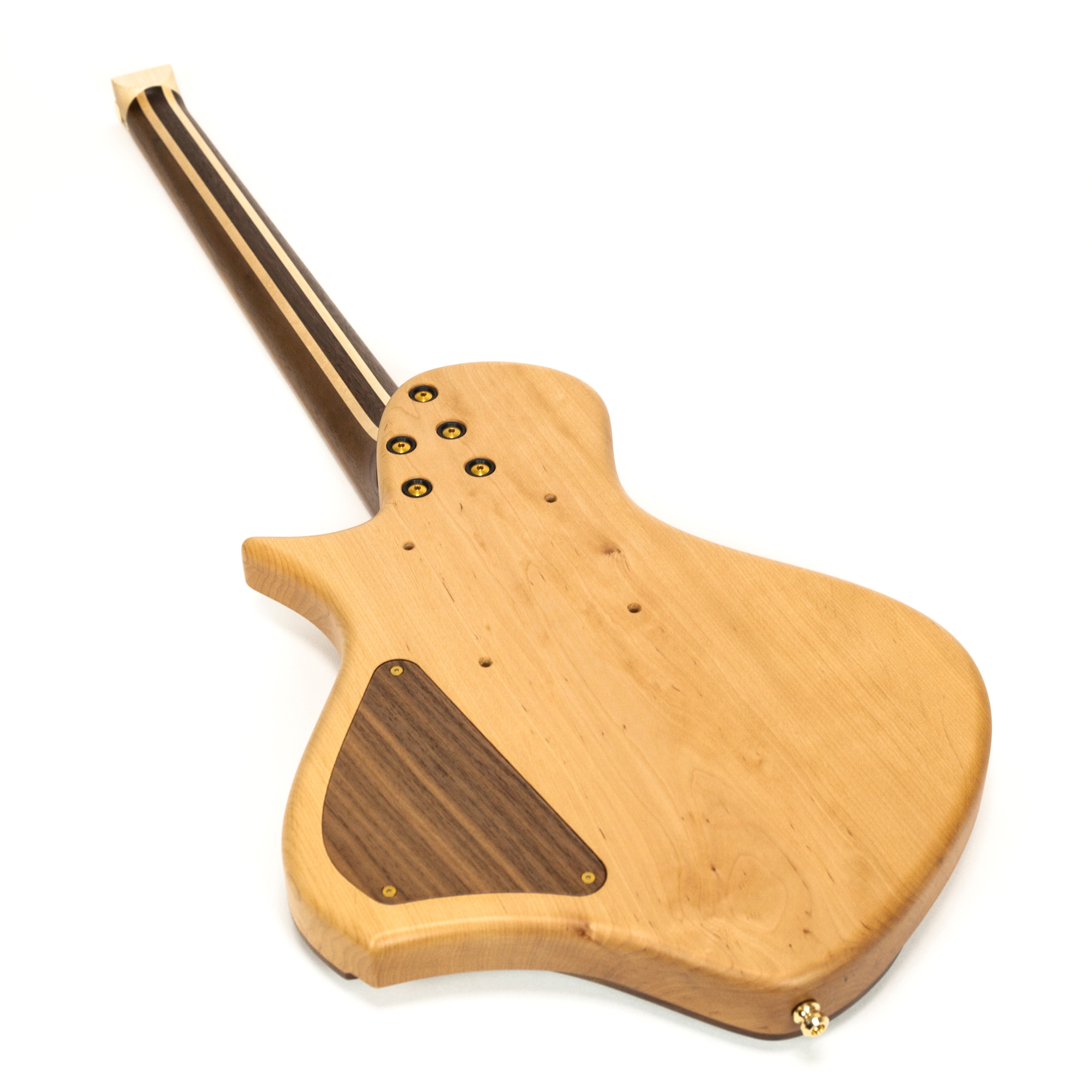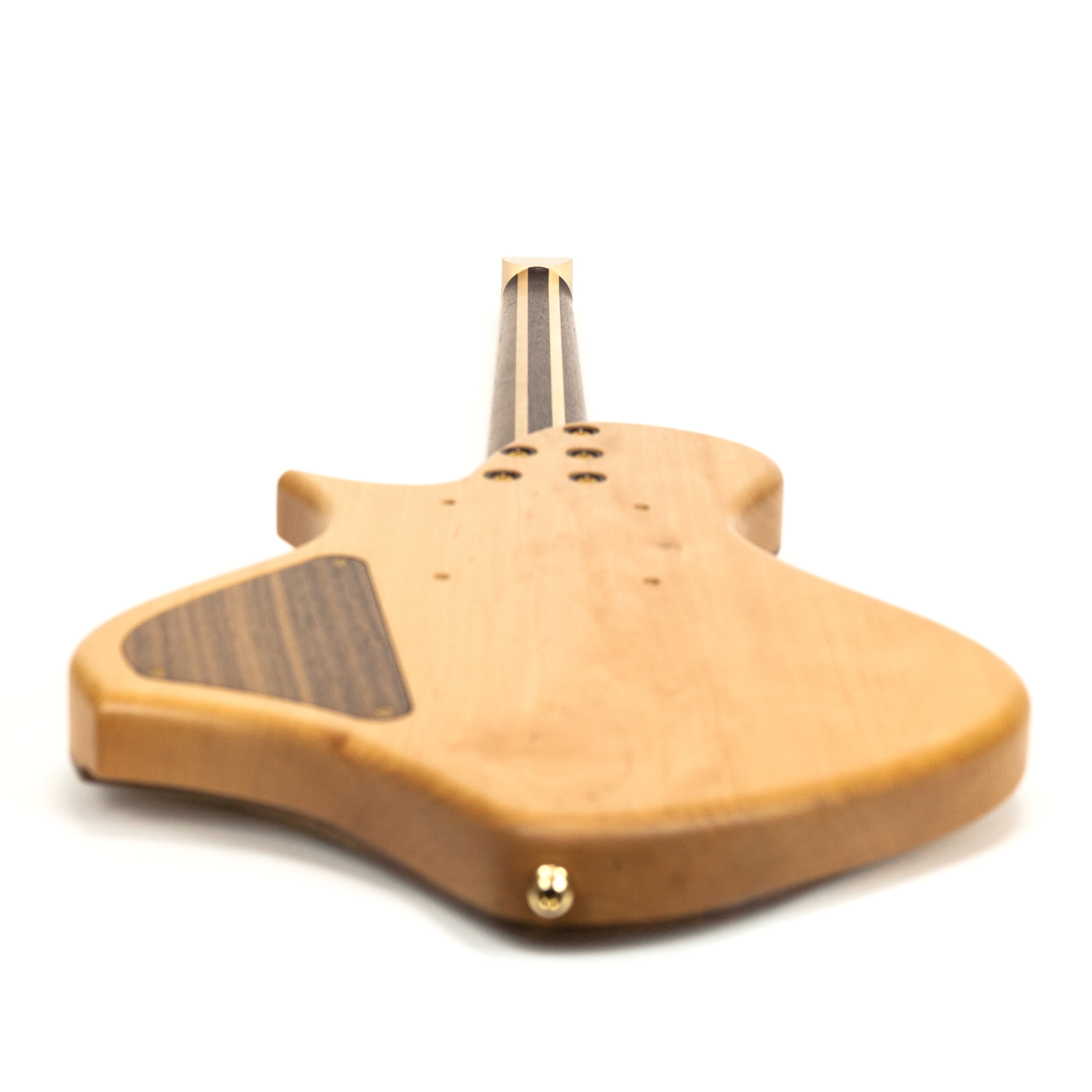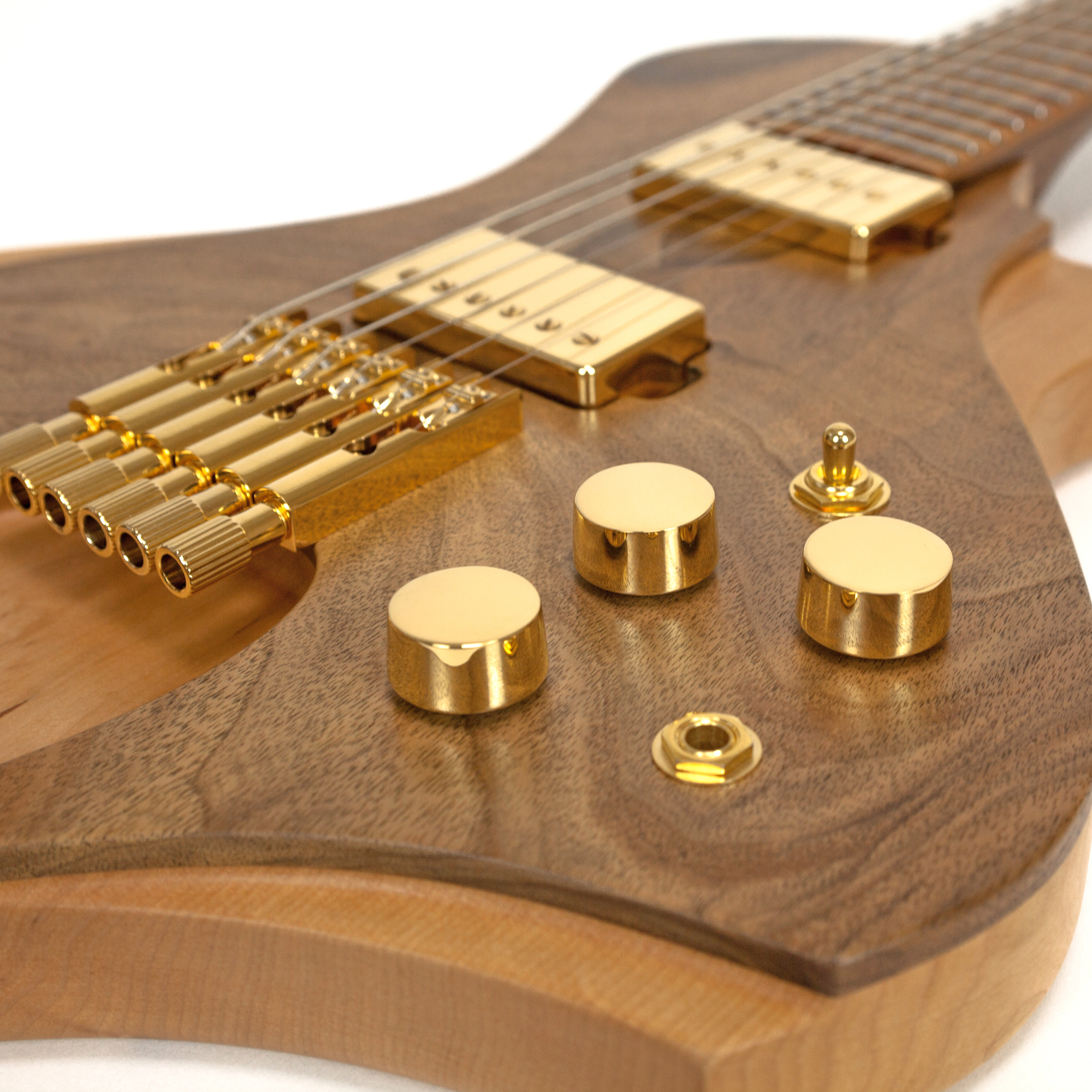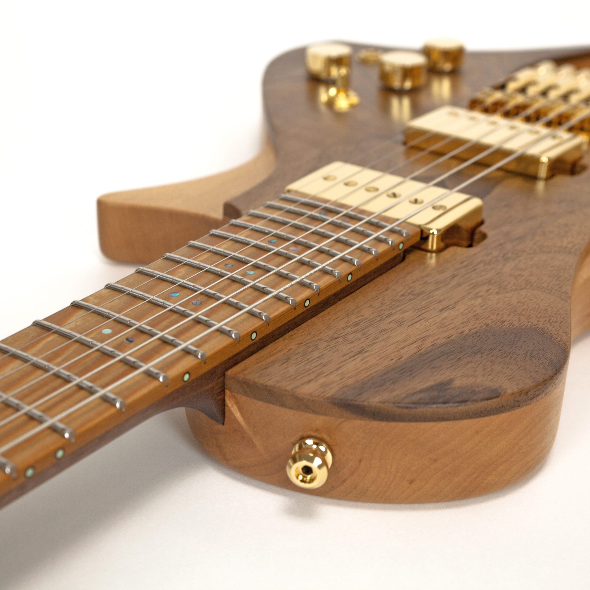 This guitar is shining with royal elegance. It is not a screamer, instead it is inspiring by its harmonic aura. Walnut and alder are building the contrast for the body. The golden hardware blends harmoniously into the color scheme. The fretboard material is Sonowood, a hightech material made of 100% wood with no additives, being harder than ebony (thats why it is also called “Swiss Ebony”). Furthermore the neck features a titan reinforcement. Both contribute to an almost endless sustain of the guitar.