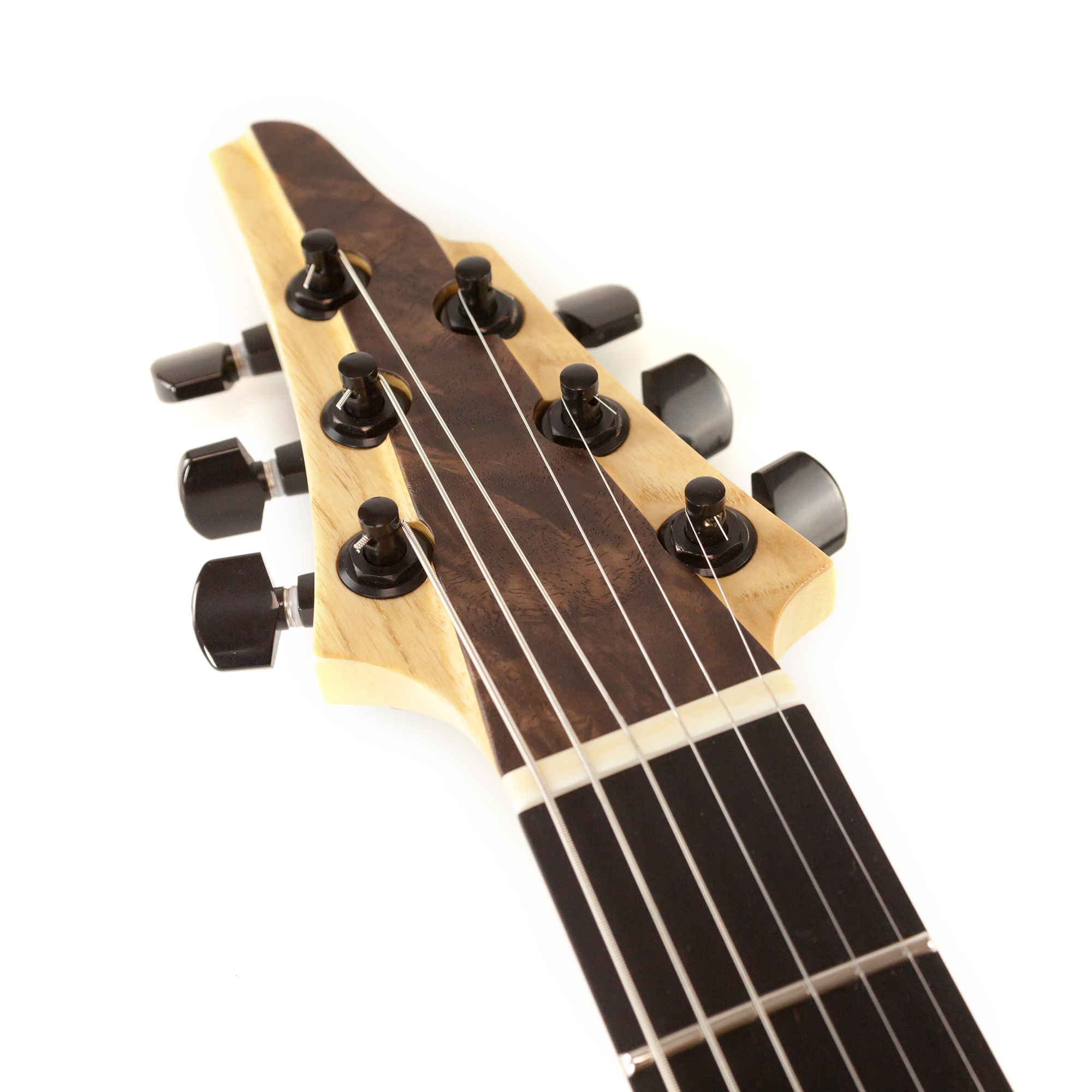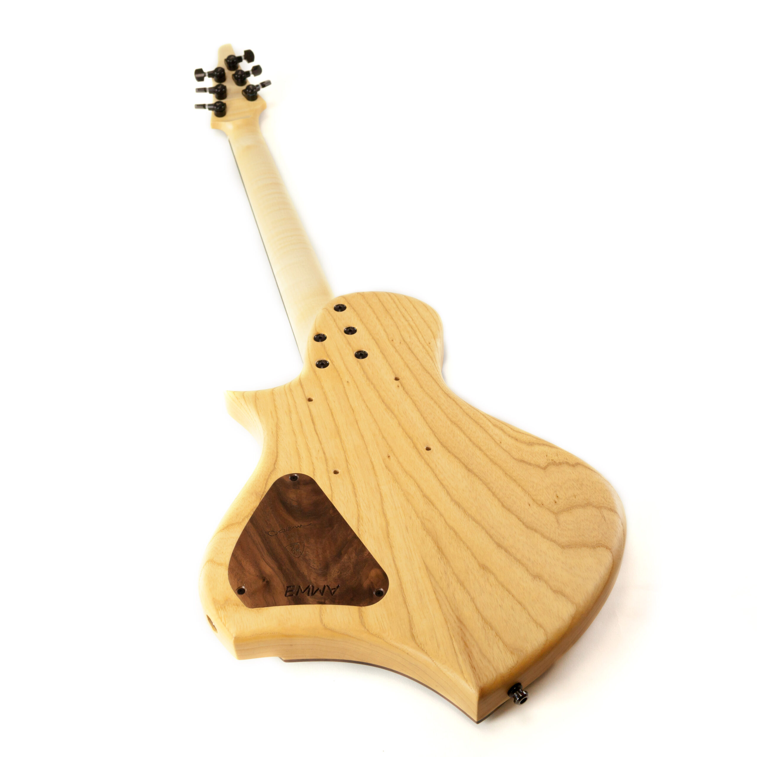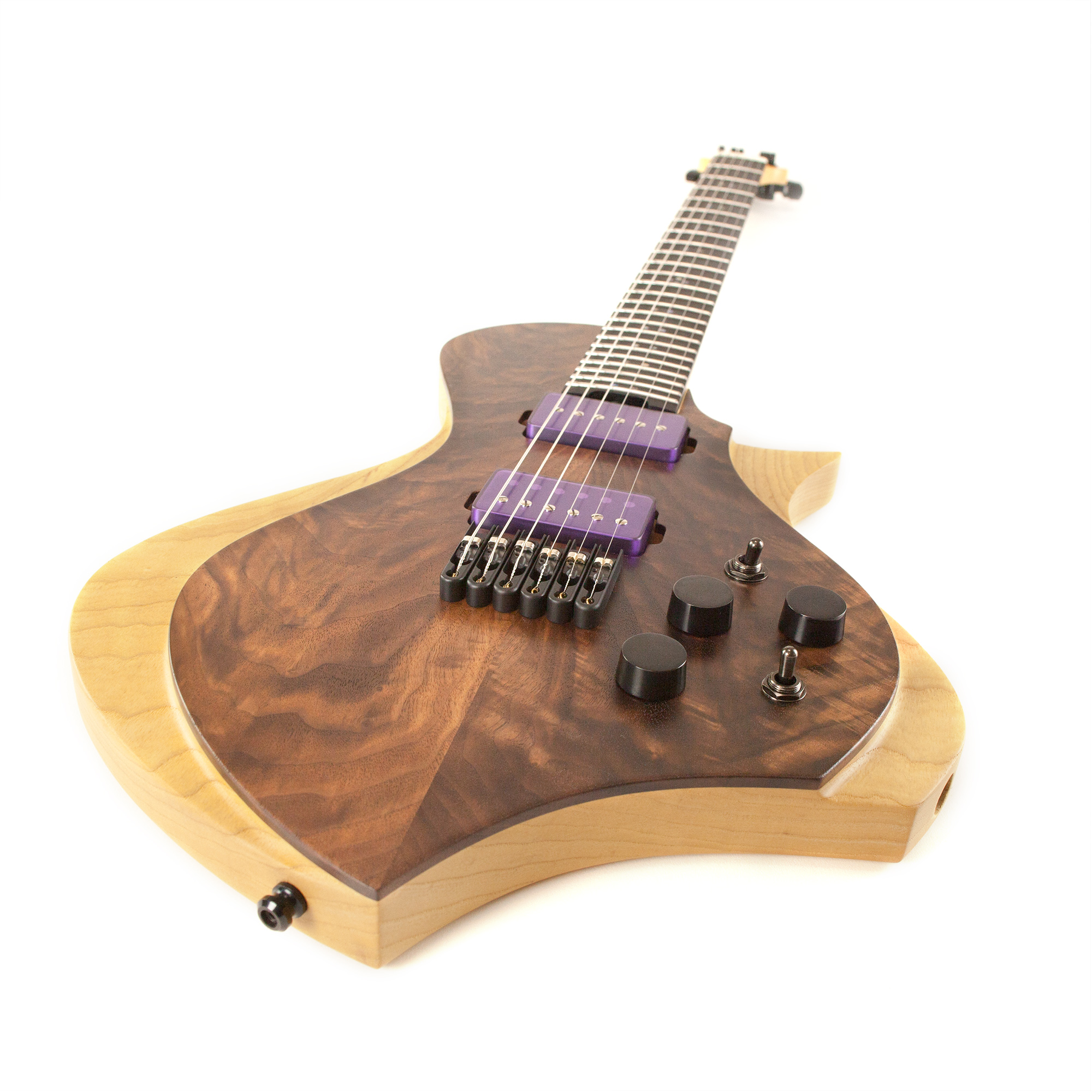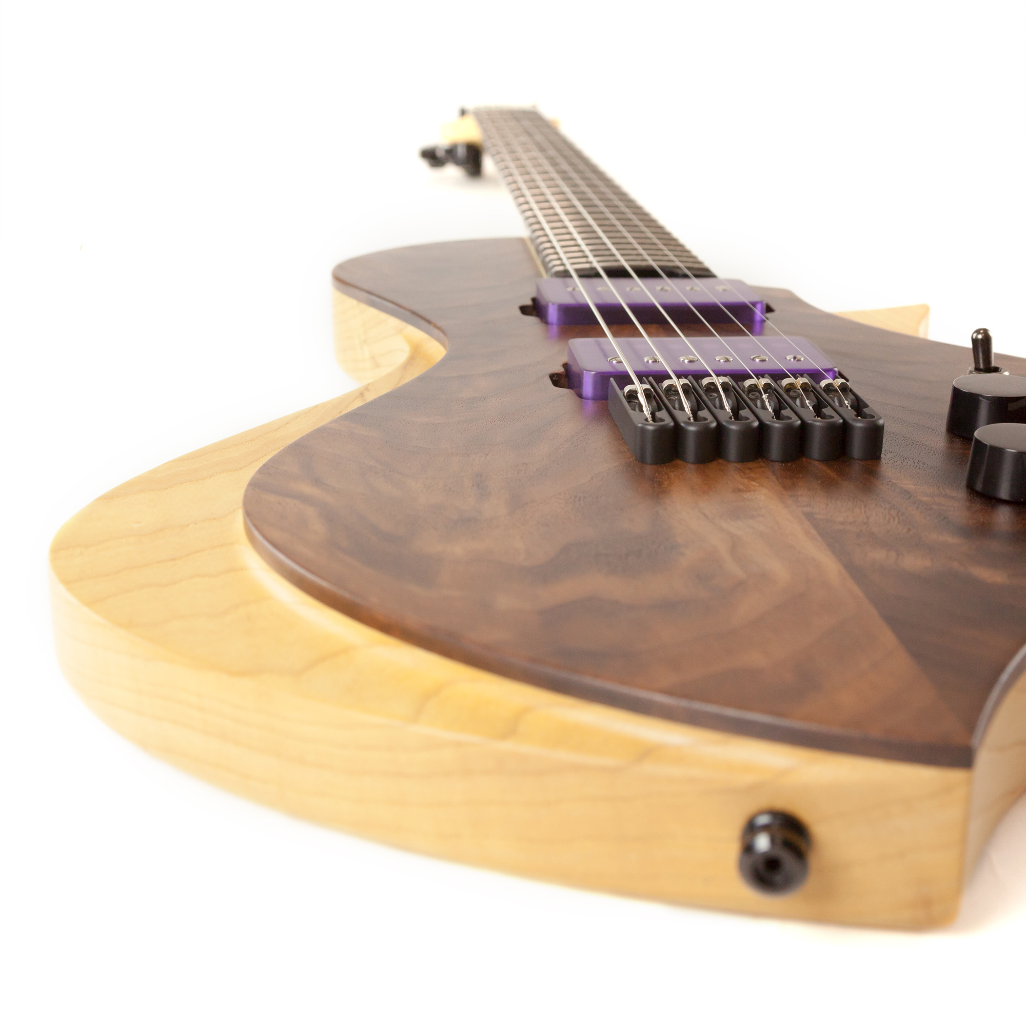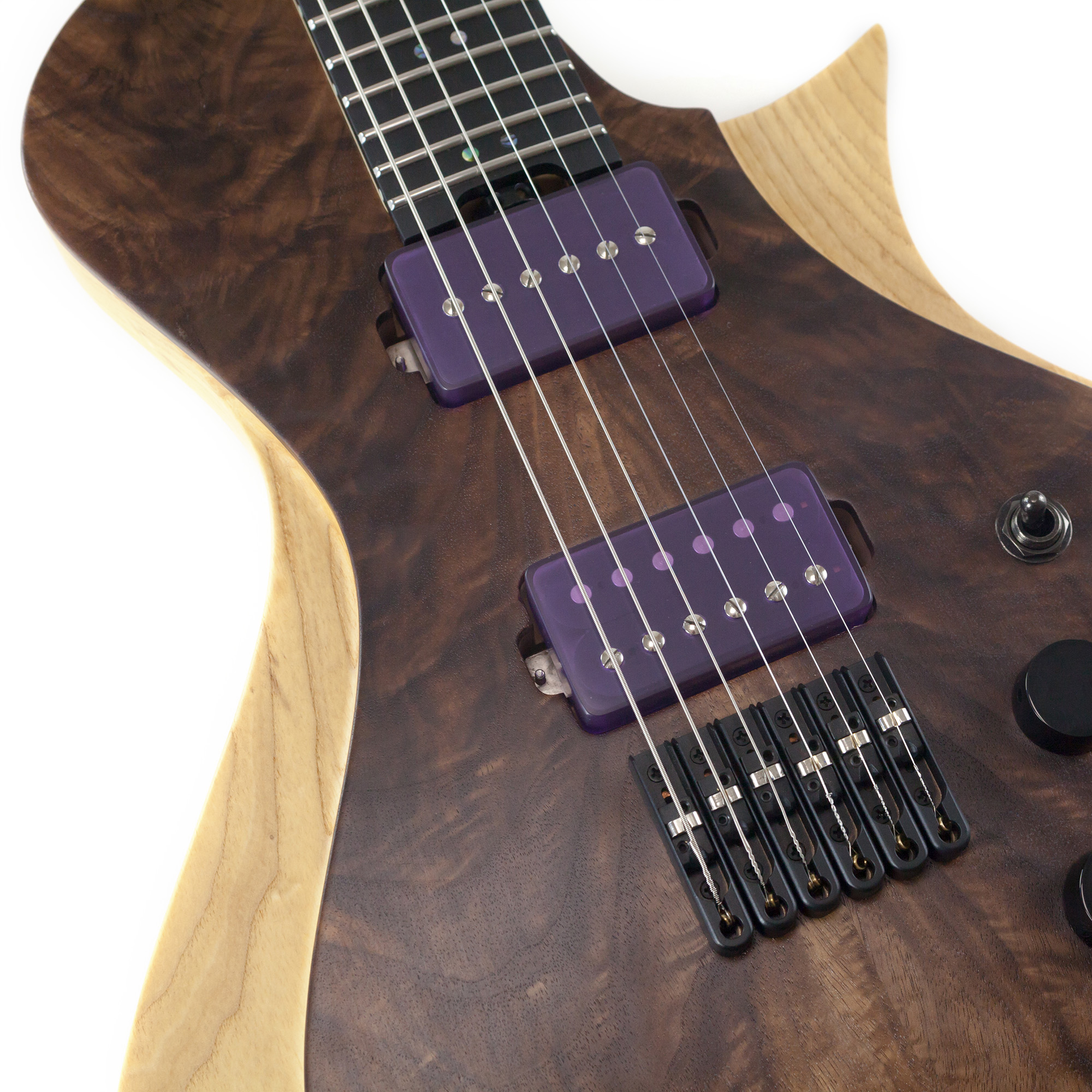 The body woods present themselves in a beautiful contrast, emphasizing the unique shape of the Levora. While the two-piece body made of swamp ash with the cleverly used course of the grain emphasizes the dynamic side of the design, the excitingly figured top made of walnut gives the guitar a very noble appearance. A special highlight are the delicate purple covers made of translucent epoxy, which adorn the guitar, which comes rather in earthy tones, with a certain lightness and insouciance. Also from its technical side, this guitar stands out from the crowd, with the piezo elements built into the bridge, amplified via the internal high definition preamp, adding a very useful acoustic amusing component to the instrument’s sound diversity. On the back, especially the neck made of flamed maple flatters the eye and hands of the player, while the pickups wound by pickup specialist Harry Häussel spoil the ears of all with dynamic and high-definition sounds.