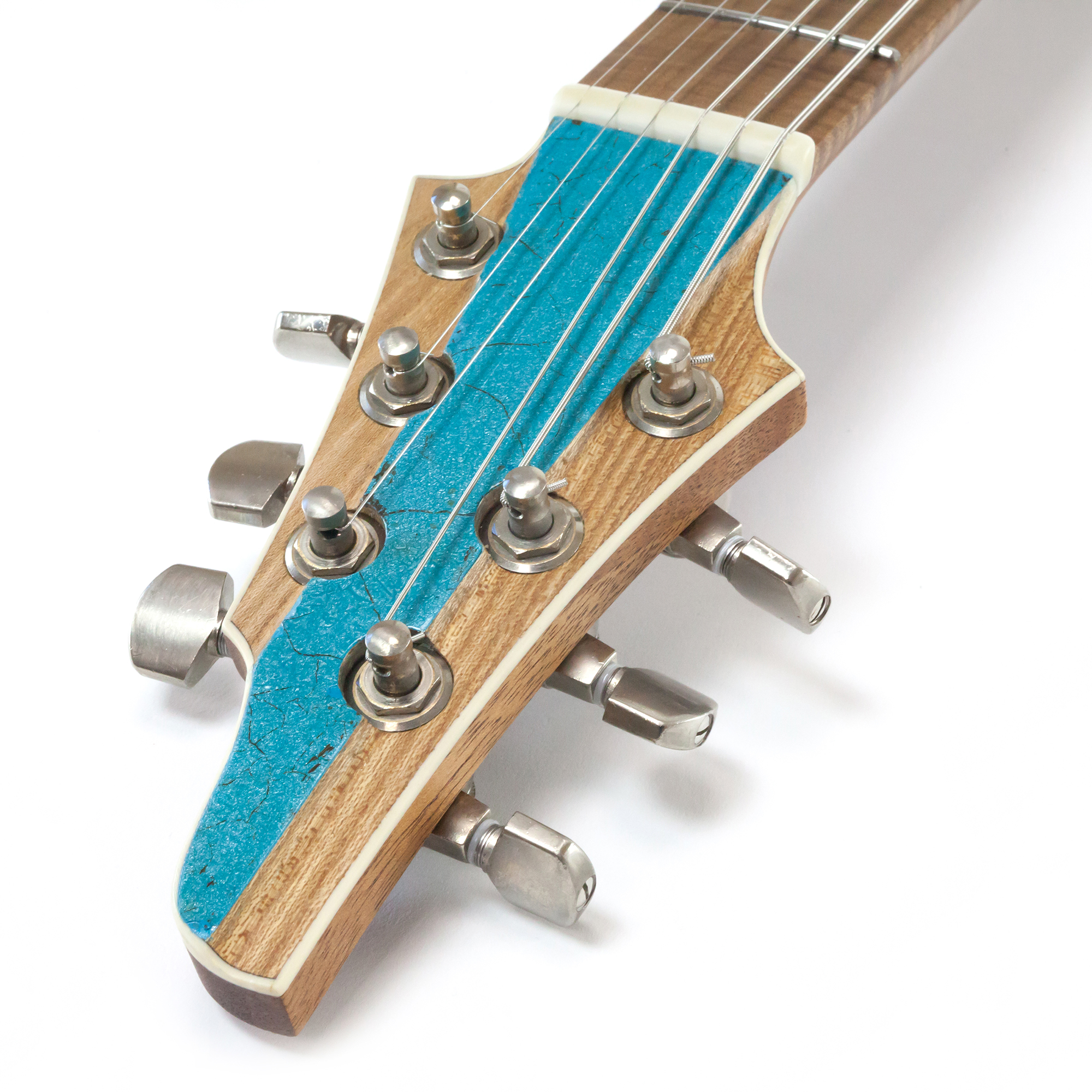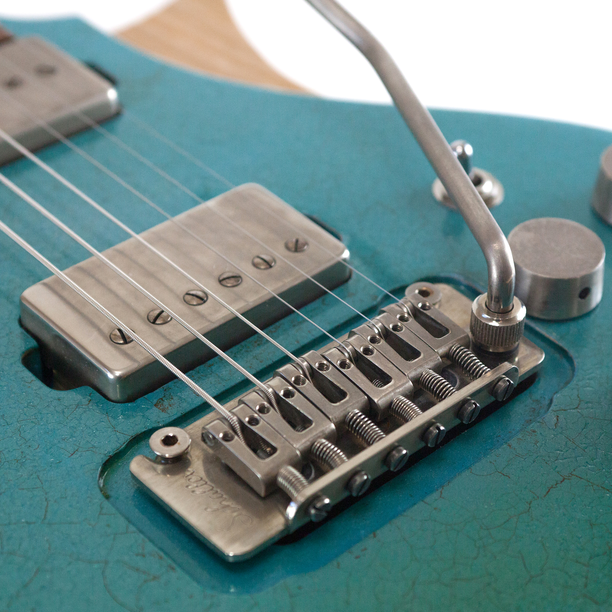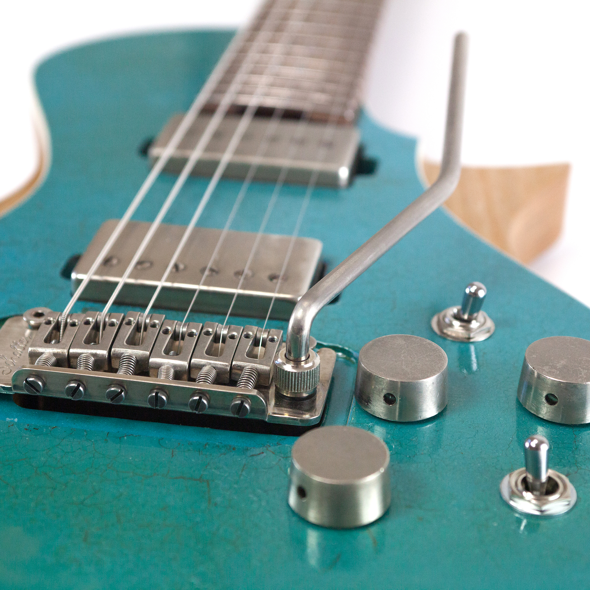 Vintage-Optik kombiniert mit modernen Details prägen diese Levora. Die in petrolgrüner Metallicfarbe lackierte Decke wird von einem creme-weißen Binding umrahmt, und betont so die dynamische Form der Gitarre. Als Holz für den Korpus wurde Ulme gewählt. Dieses durch das große Ulmensterben immer seltener werdende Holz mit seiner warmen goldenen Farbe und seiner markanten Maßerung ist ein echter Hingucker, ohne dabei aufdringlich zu wirken. Das freischwebende Vibrato wurde passend zur restlichen Hardware geaged. Die Rückseite erlaubt einen Blick in das Federnsystem, welches geschickt in den Korpus eingebaut wurde, ohne die Form der Gitarre durch unnötig ausgefräste Flächen zur irritieren. Ein Splitschalter ermöglicht es, den Humbucker in der Brückenposition zum Single-Coil zu schalten, was der Gitarre eine interessante und ernstzunehmende Klangvariation hinzufügt.