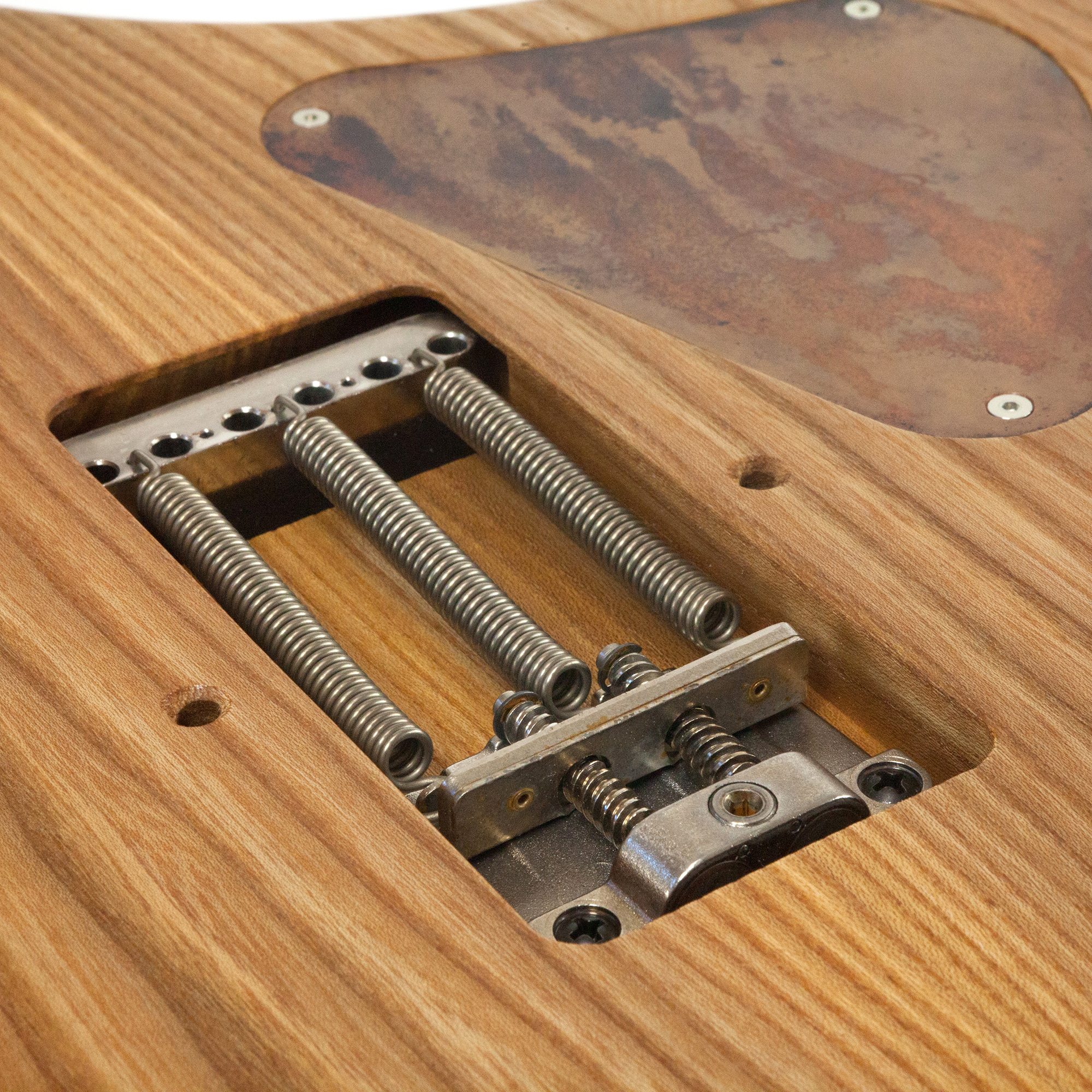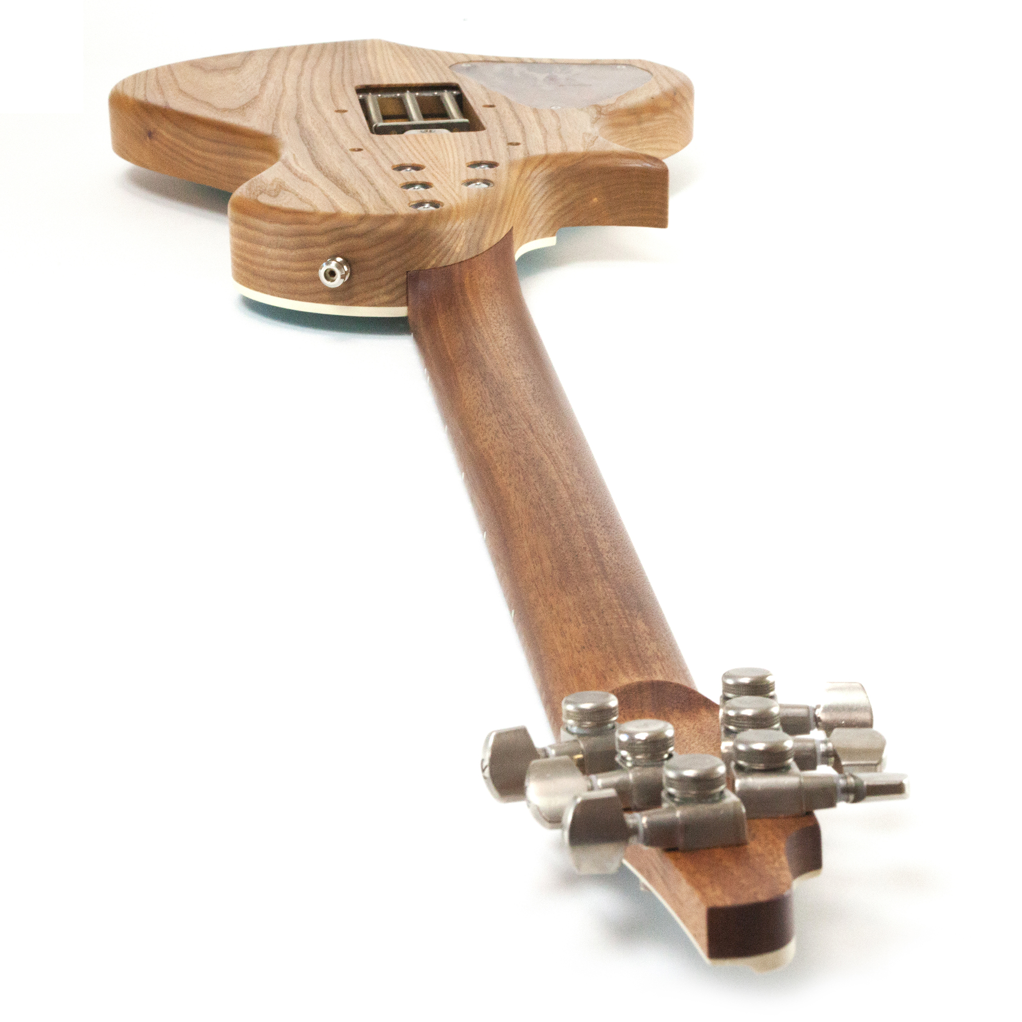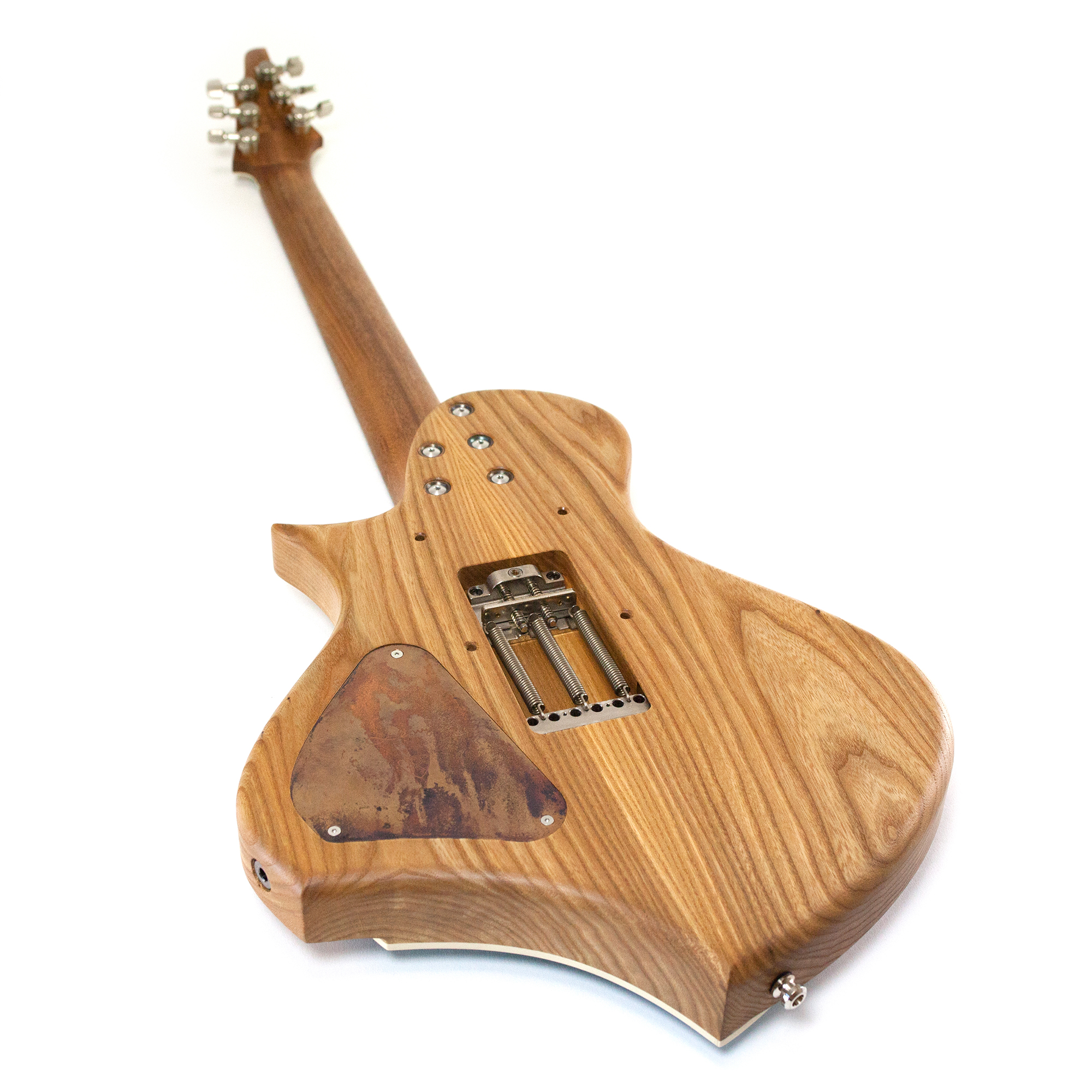 Vintage-Optik kombiniert mit modernen Details prägen diese Levora. Die in petrolgrüner Metallicfarbe lackierte Decke wird von einem creme-weißen Binding umrahmt, und betont so die dynamische Form der Gitarre. Als Holz für den Korpus wurde Ulme gewählt. Dieses durch das große Ulmensterben immer seltener werdende Holz mit seiner warmen goldenen Farbe und seiner markanten Maßerung ist ein echter Hingucker, ohne dabei aufdringlich zu wirken. Das freischwebende Vibrato wurde passend zur restlichen Hardware geaged. Die Rückseite erlaubt einen Blick in das Federnsystem, welches geschickt in den Korpus eingebaut wurde, ohne die Form der Gitarre durch unnötig ausgefräste Flächen zur irritieren. Ein Splitschalter ermöglicht es, den Humbucker in der Brückenposition zum Single-Coil zu schalten, was der Gitarre eine interessante und ernstzunehmende Klangvariation hinzufügt.