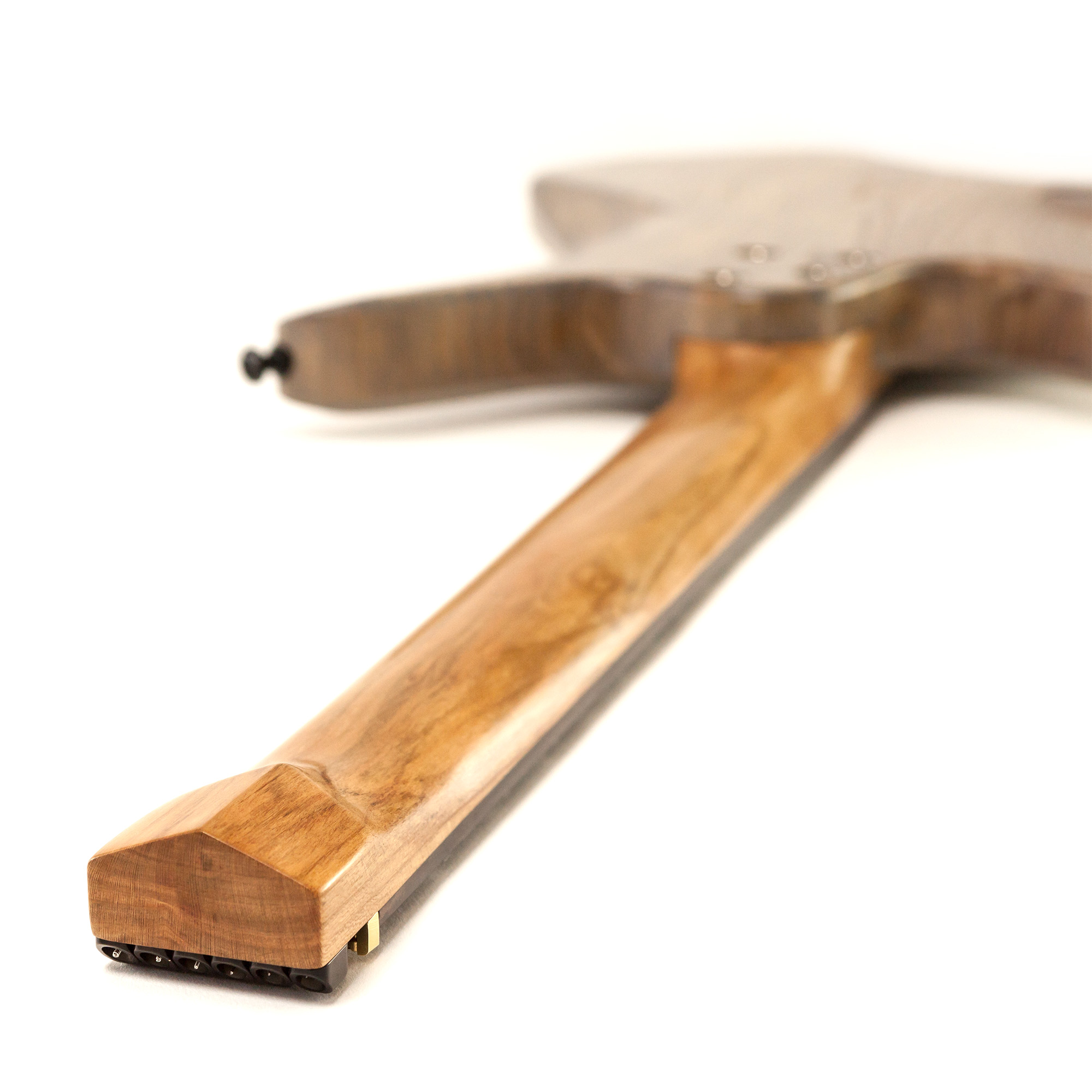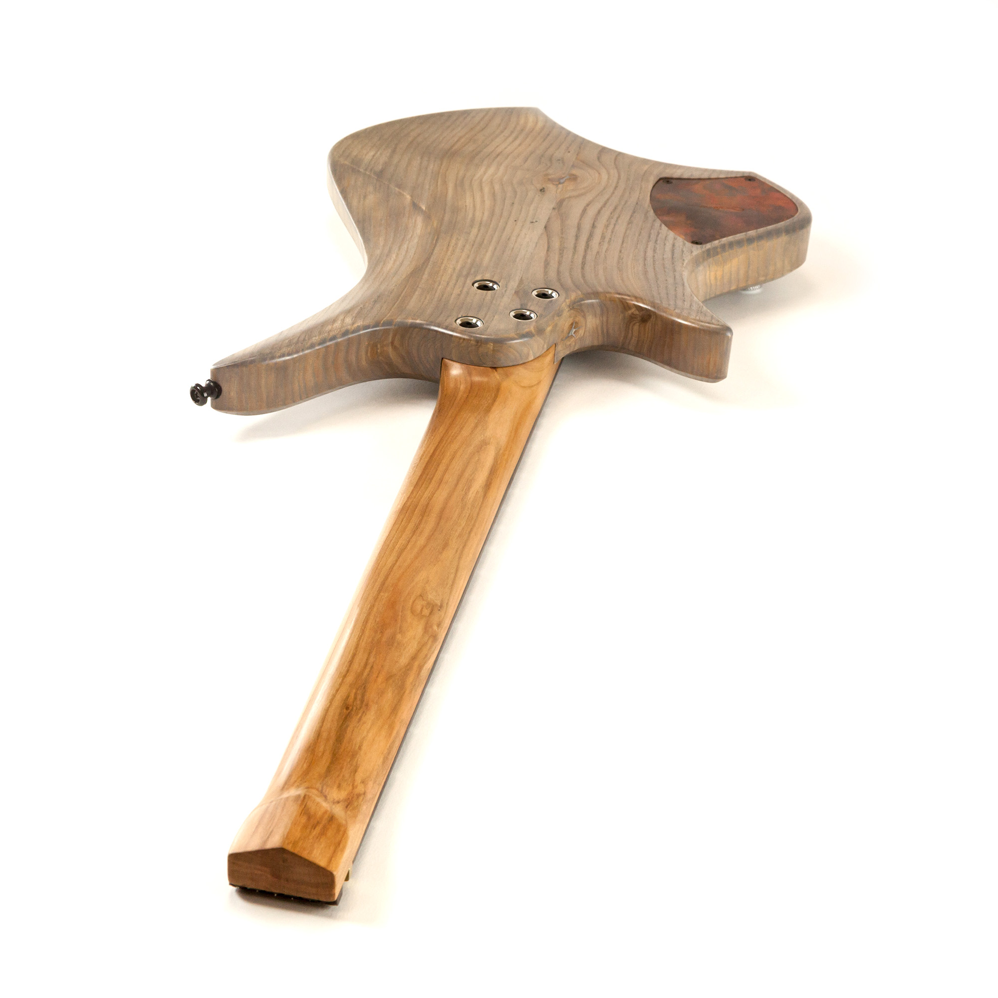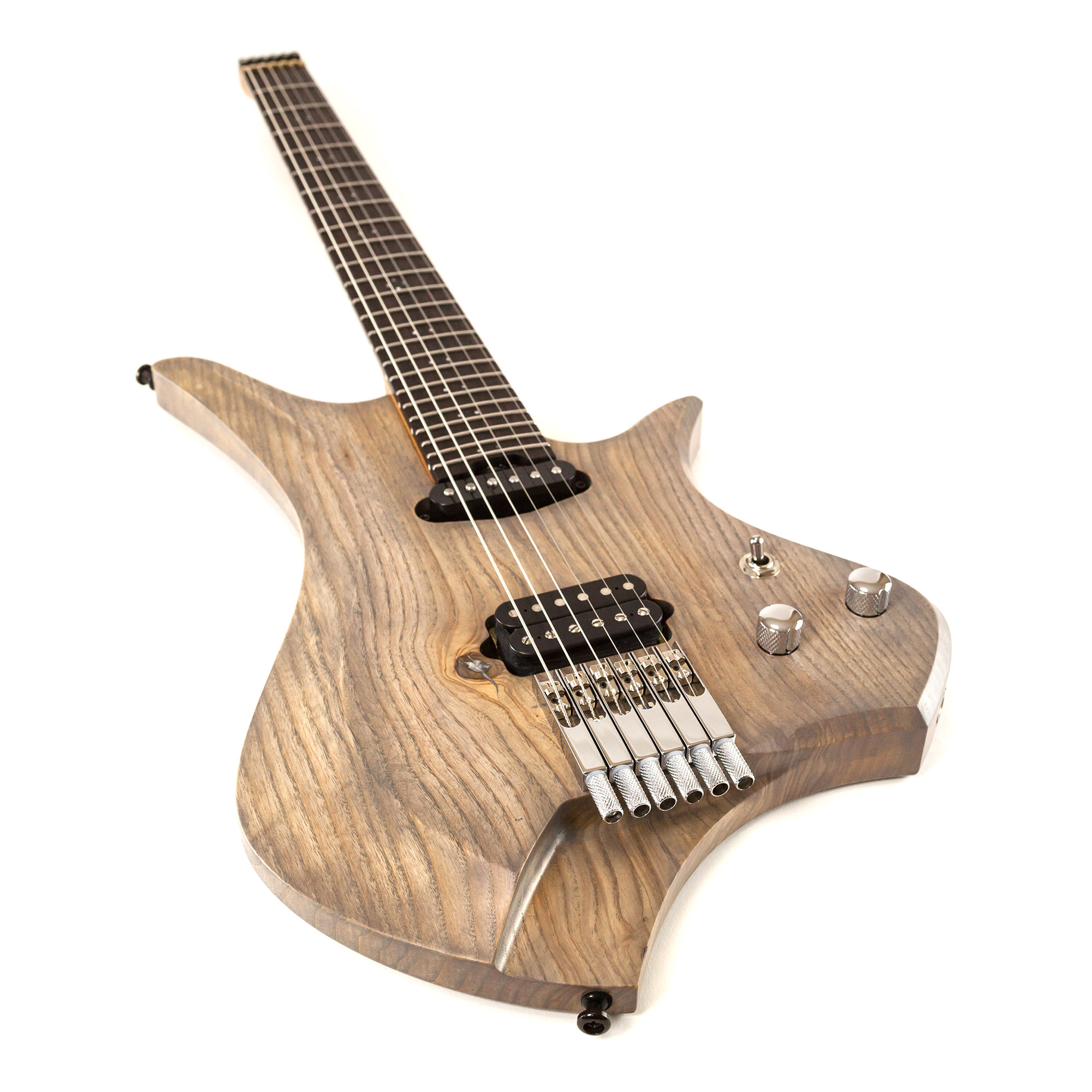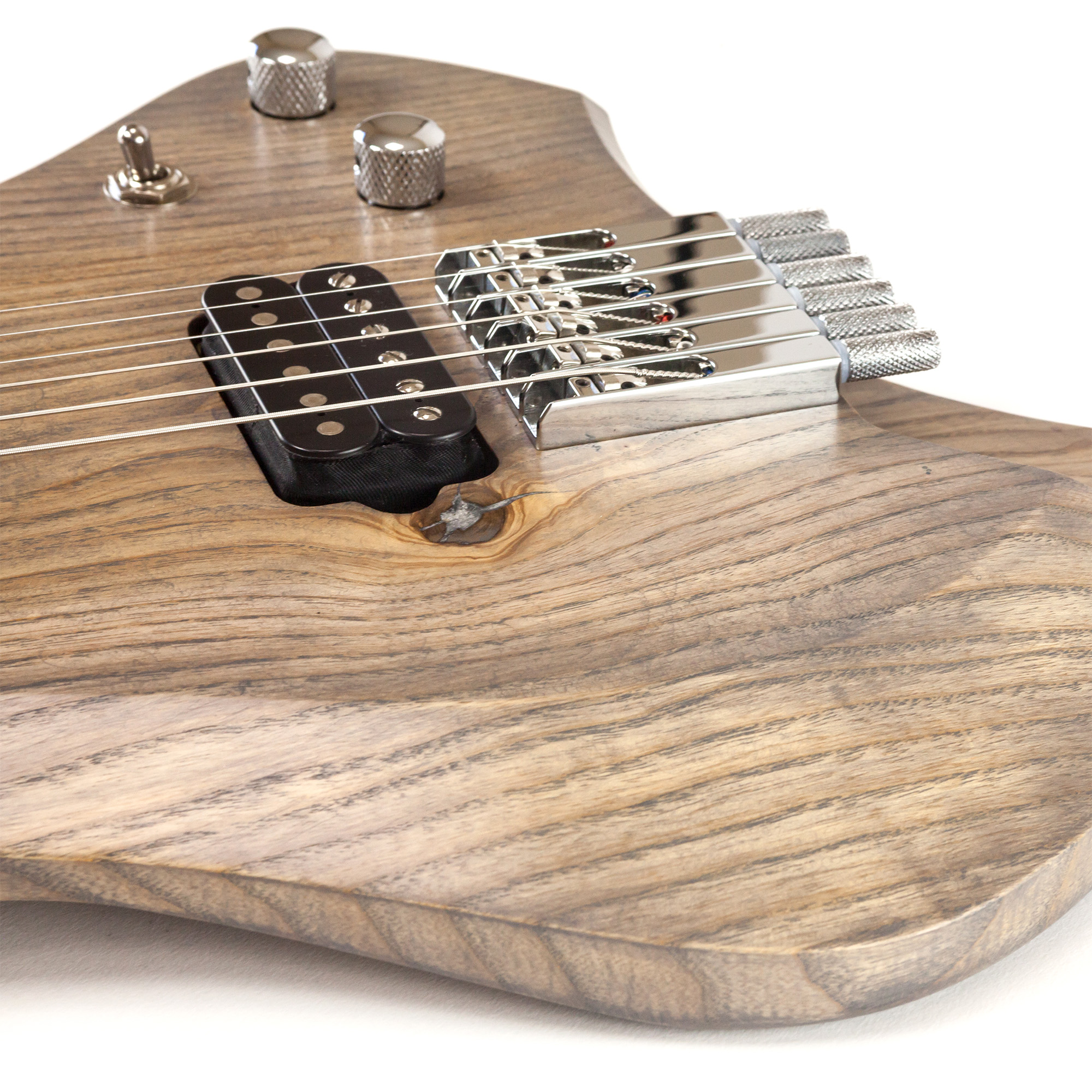 Für diese Tenua kamen überwiegend heimische Hölzer zum Einsatz. Die Esche des Korpus stand im eigenen Garten und wurde vor vielen Jahren vom Urgroßvater gefällt, geschnitten und verbrachte danach viele Jahre auf dem Dachboden der Werkstatt. Versehen mit einem gräulichen Rustikaleffekt fügt sie sich farblich harmonisch zwischen die schwarzen Tonabnehmer und der verchromten Hardware ein. Einen schönen Kontrast bildet das dunkle Palisandergriffbrett mit dem Hals aus Kirsche, ebenfalls aus eigener Ernte, die mit ihrem warmen Farbton und der wilden Struktur einen markanten Beitrag zum Erscheinungsbild der Gitarre leistet. Der Materialmix der Hals-Korpusverbindung fügt der Rückseite der Gitarre ein spannendes Detail hinzu. Mit ihrem kompakten Korpus, der kurzen Mensur und einem Gewicht unter drei Kilogramm ist diese Gitarre besonders handlich und stellt dabei mit 24 Bünden und den zwei unterschiedlichen Tonabnehmern ein breites Klangbild zur Verfügung.
